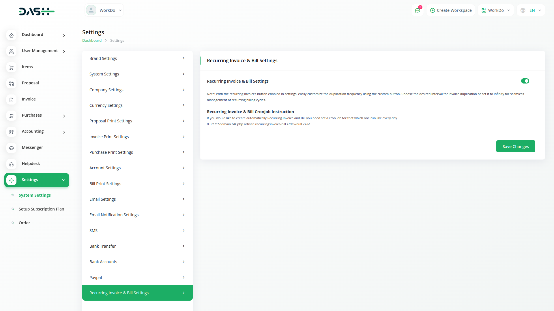 Managing recurring invoices/bills can be a cumbersome task for businesses, often requiring manual intervention and meticulous attention to detail. However, with the introduction of the Recurring Invoice/Bills Integration feature in Dash SaaS, businesses can now streamline their invoicing process effortlessly. By enabling this feature from the settings page, users gain access to a powerful tool that automates the creation and management of recurring invoices/bills, saving valuable time and resources.